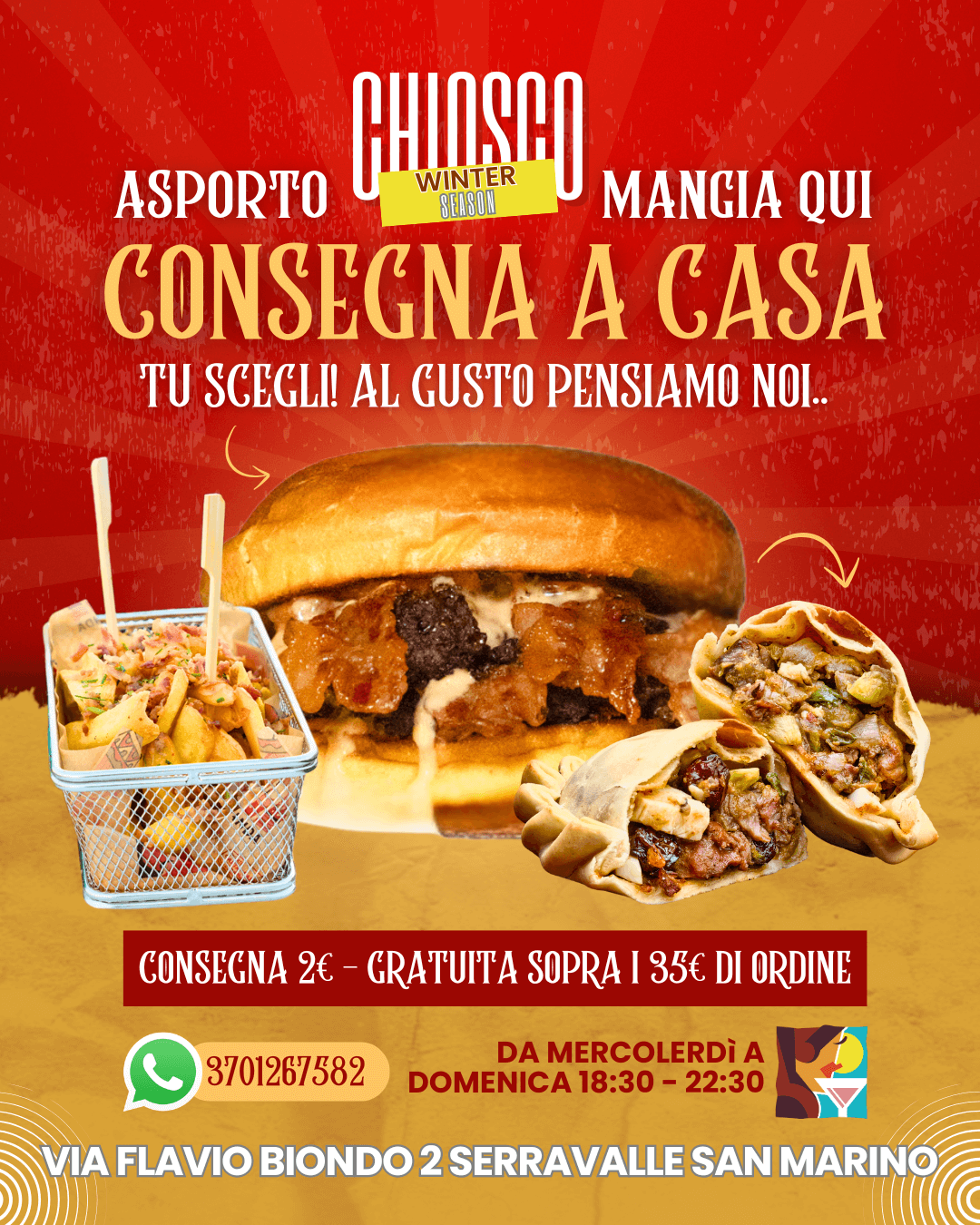 Dal mercoledì alla domenica, dalle 18:30 alle 22:30, puoi gustare il nostro menù anche a casa tua. Effettuiamo servizio di asporto e consegna a domicilio. Ordina con un messaggio su